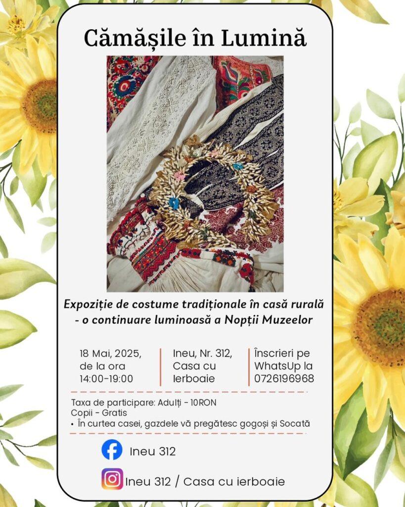 În weekendul care urmează, pasionații de cultură tradițională din Bihor sunt invitați să pășească într-o casă tradițională, la doar câțiva pași de Oradea. Sâmbătă, 18 mai, satul Ineu va găzdui „Cămășile pe Lumină” — o expoziție de costume populare românești. Aceasta va avea loc într-o casă țărănească recondiționată cu grijă, cunoscută drept „Casa cu Ierboaie” din Ineu, nr. 312.