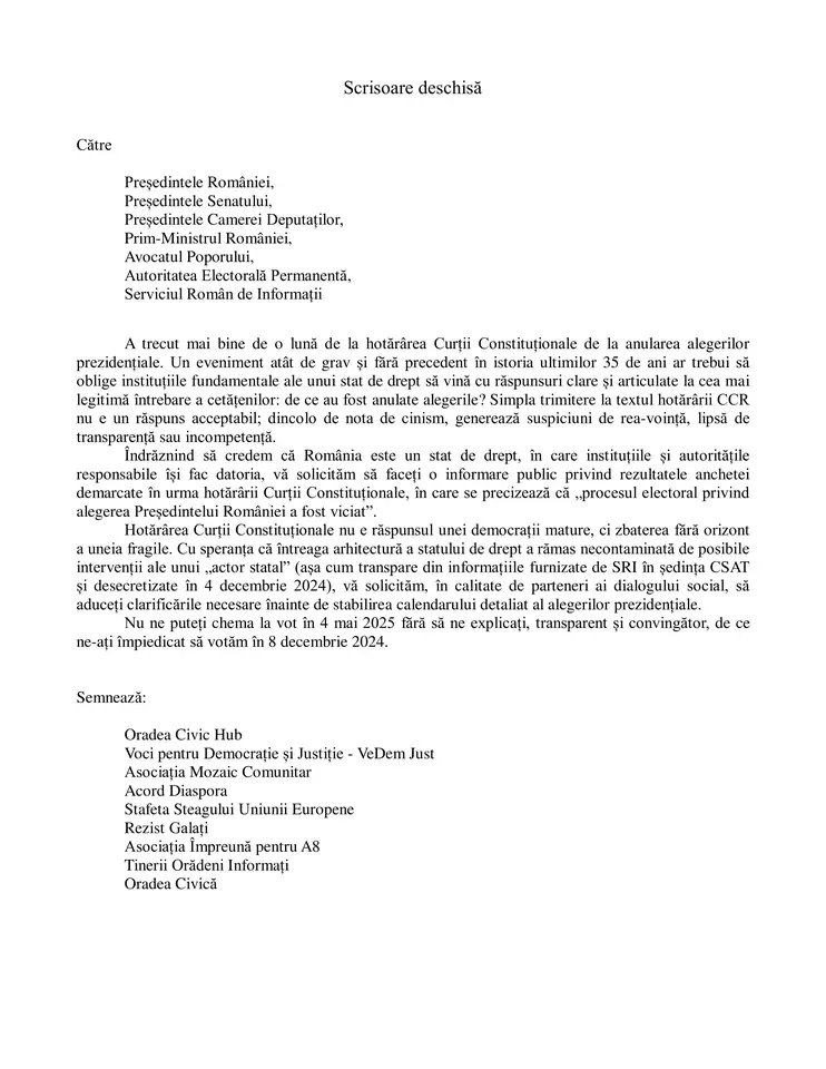 Trei organizații civice din Oradea – Oradea Civic Hub, Tinerii Orădeni Informați și Oradea Civică – au solicitat, alături de alte asociații din țară, ca autoritățile române să facă publice rezultatele anchetei care au stat la baza deciziei Curții Constituționale a României (CCR) de anulare a alegerilor prezidențiale din 2024. Demersul vine printr-o scrisoare deschisă adresată președintelui României, premierului, liderilor Parlamentului, Avocatului Poporului, Autorității Electorale Permanente (AEP) și Serviciului Român de Informații (SRI).