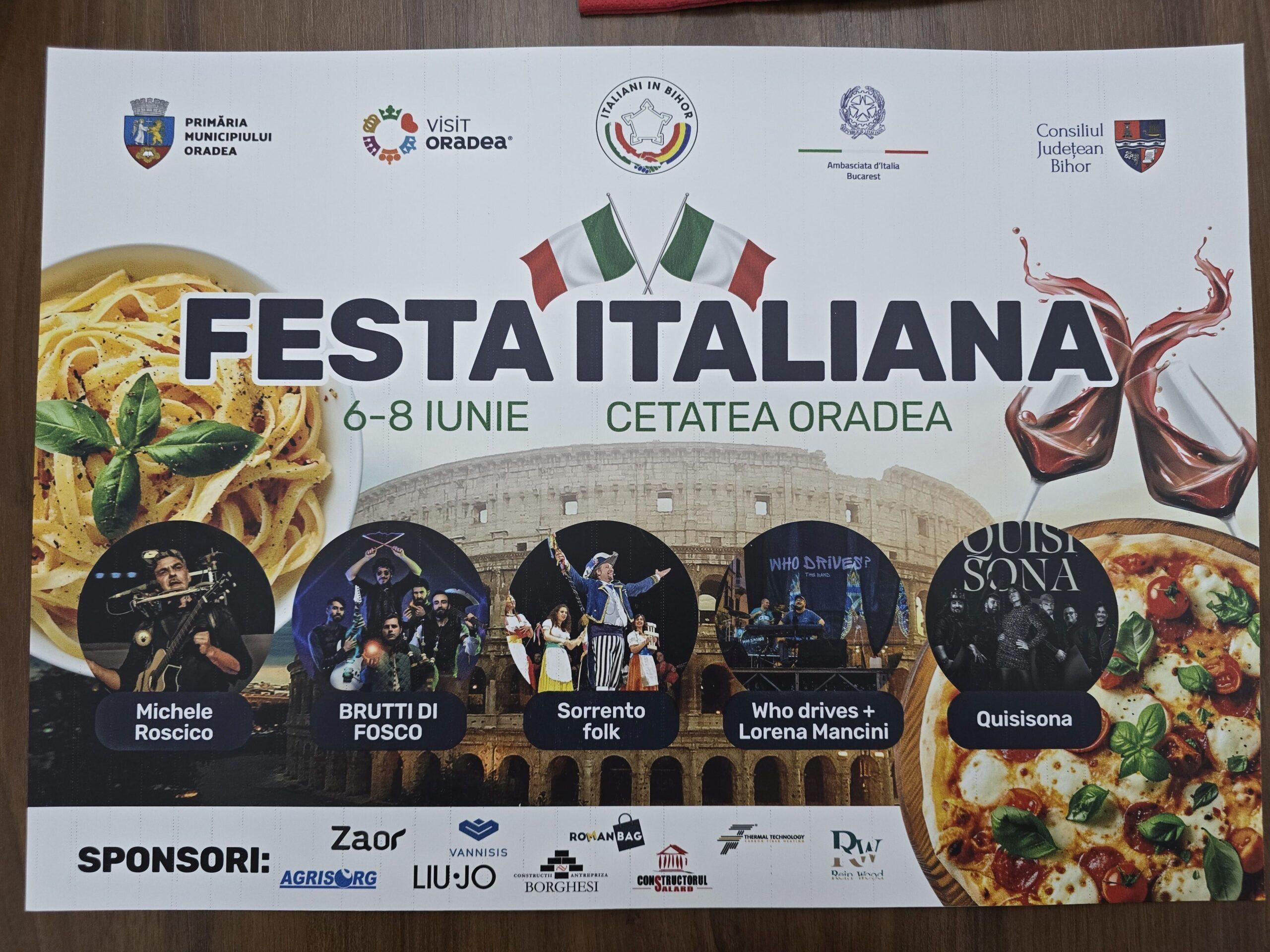 Oradea găzduiește, între 6 și 8 iunie, prima ediție a Festa Italiana. Evenimentul este dedicat culturii italiene și este organizat de Asociația Italieni în Bihor, în parteneriat cu Visit Oradea. Astfel, timp de trei zile, Cetatea Oradea se va transforma într-un colț de bella Italia, animată de muzică live, gastronomie specifică, dansuri tradiționale și activități pentru copii.