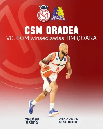 Duminică, 29 decembrie, pasionații de baschet sunt invitați la meci, la Oradea Arena. De la ora 18:00, CSM CSU Oradea va înfrunta echipa SCM winsed.swiss Timișoara.
