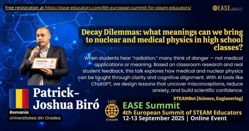 Patrick-Joshua Biro, absolvent al programelor de Fizică Medicală și Istorie ale Universității din Oradea, va susține o prezentare în cadrul European Summit of STEAM Educators, conferință internațională aflată la cea de-a patra ediție. Evenimentul are loc online, în zilele de 12 și 13 septembrie, și reunește 45 de vorbitori din mai multe colțuri ale lumii.