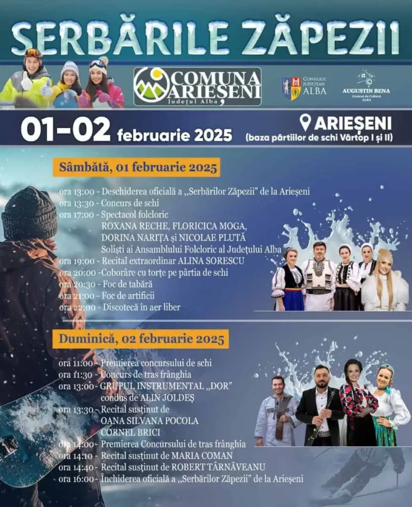 Încep Serbările Zăpezii la Arieșeni, ediția 2025. Evenimentul va avea loc în weekend-ul 1-2 februarie la baza pârtiilor Vârtop I și II din Arieșeni, precum și la telescaunul Piatra Grăitoare din satul de vacanță Vârtop – Nucet.