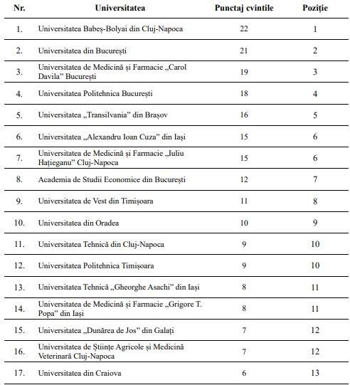 În fruntea clasamentului se află Universitatea Babeș-Bolyai, urmată de Universitatea din București și Universitatea de Medicină și Farmacie „Carol Davila” din București. Pe locurile următoare se situează Universitatea Politehnică București, Universitatea Transilvania din Brașov și Universitatea „Alexandru Ioan Cuza” din Iași, ultima fiind la egalitate cu UMF „Iuliu Hațieganu” Cluj-Napoca. Universitatea din Oradea și-a câștigat poziția pe locul 9, depășind alte instituții prestigioase.
