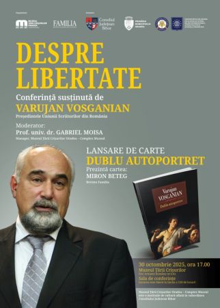 Muzeul Țării Crișurilor Oradea – Complex Muzeal va găzdui joi, 30 octombrie 2025, de la ora 17.00, o întâlnire deosebită cu scriitorul și omul de cultură Varujan Vosganian. Evenimentul, intitulat „Despre libertate”, este organizat împreună cu Revista Familia și are loc în parteneriat cu Consiliul Județean Bihor, Primăria Oradea și Facultatea de Istorie, Relații Internaționale, Științe Politice și Științele Comunicării din cadrul Universității din Oradea.