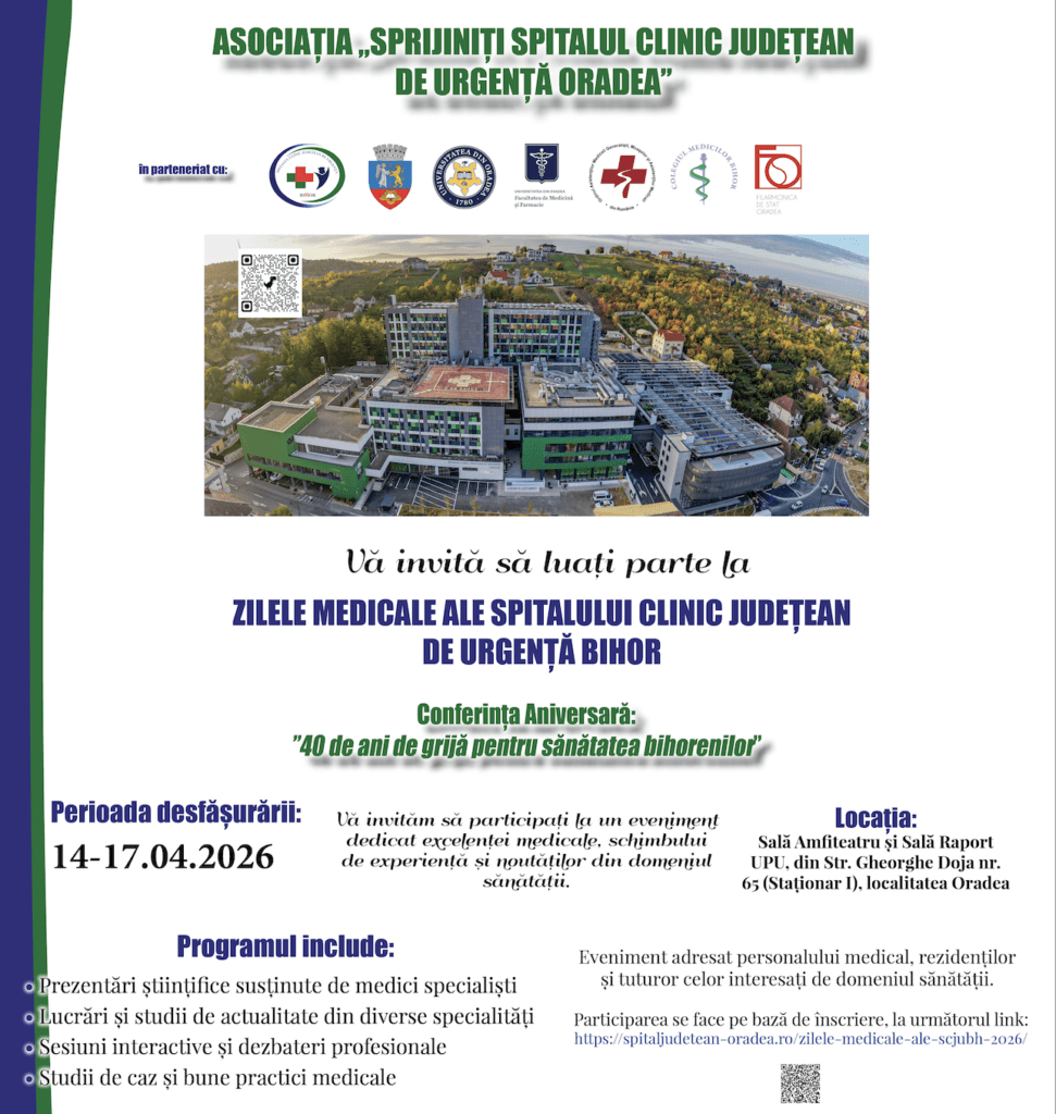 La Oradea va avea loc, în perioada 14–17 aprilie 2026, evenimentul „Zilele Medicale ale Spitalului Clinic Județean de Urgență Bihor”. Manifestarea este organizată de Asociația „Sprijiniți Spitalul Clinic Județean de Urgență Oradea”, alături de Spitalul Clinic Județean de Urgență Bihor, Primăria Oradea, Universitatea din Oradea – Facultatea de Medicină și Farmacie, Colegiul Medicilor Bihor, Ordinul Asistenților Medicali Generaliști, Moașelor și Asistenților Medicali din România și Filarmonica de Stat Oradea.