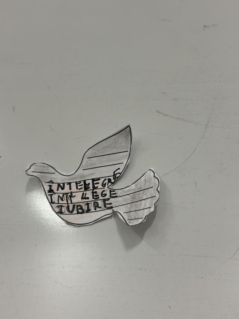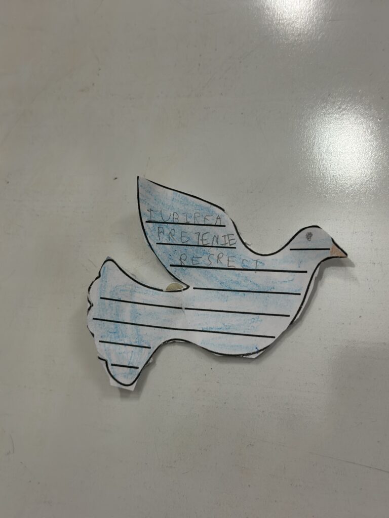 În sala de clasă, atmosfera a fost una plină de culoare: pe foi simple, fiecare copil a scris câte un cuvânt prin care înțelege ce înseamnă „PACE”. Pentru unii, pacea înseamnă prietenie, pentru alții iubire, armonie, zâmbete sau bunătate. Dincolo de inocența vârstei, mesajele copiilor au surprins esența acestei valori universale.